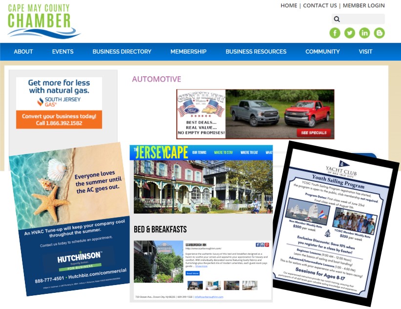 Marketing Services The Cape May County Chamber provides a range of high-quality, cost-effective advertising and marketing opportunities to connect with both businesses and tourists. From email campaigns to website sponsorships, print ads in the Jersey Cape Vacation Guide and Calendar of Events Brochure, we offer multiple ways to amplify your reach. Additionally, brochure distribution is available through our Visitors Center, ensuring maximum visibility for your brand. |